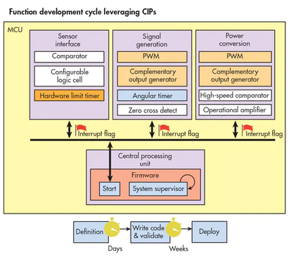 帶有 CIP 的 MCU 允許設計人員在固定功能、低功耗和永遠在線的硬件中實現其應用中對時間最敏感的部分。這樣做可以以極低的功耗為關鍵事件提供一致、低延遲的響應。