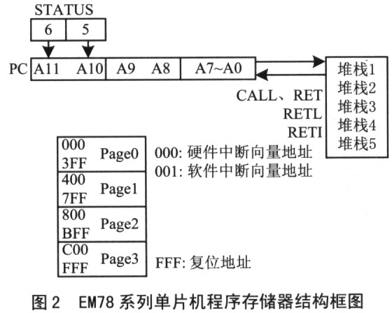 首先需要介紹一下EM 78系列單片機的程序存儲器ROM結構。EM78系列的程序存儲器ROM容量為4K×13位,采用Page(“頁”)分配原則,就是將4K的程序空間分為4頁,每個頁容量為1K。其結構如圖2所示,其中Page0(000H~3FFH)、Pagel(400H~7FFH)、Page2(800H~BFFH)、Page3(COOH~FFFH)。指令系統中的兩條長距離跳轉指令JMP和CALL,所攜帶的地址碼僅僅有lO位,210=lK地址空間,即只能在1K的空間內跳轉。當使用JMP指令時,裝入目標地址到PC程序指針的低10位;使用CALL指令時,裝入目標地址至PC程序指針的低10位,且PC+l壓棧,調用同1K頁面內的任何程序。PC程序指針(寄存器R2)和堆棧的位數是12位,即尋址空間分別為4K,一個程序頁面為lK。頁面選擇通過設定狀態寄存器R3的Bit6(PS1)、Bit5(PSO)來完成。