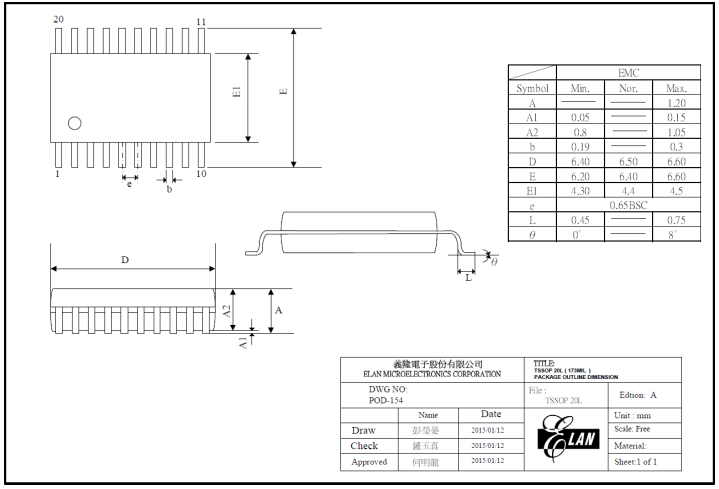 Figure C-1 EM88F794N 20-pin TSSOP Package Type