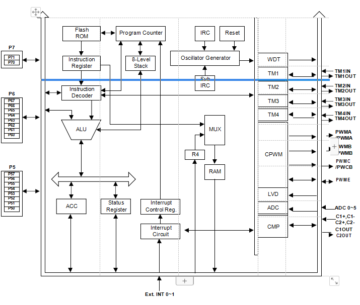 四個 16 位定時器 (TM1/TM2/TM3/TM4) 具有七種模式:定時器/計數(shù)器/捕捉/窗口/蜂鳴器/PWM/PDO(可編程分頻器輸出)模式