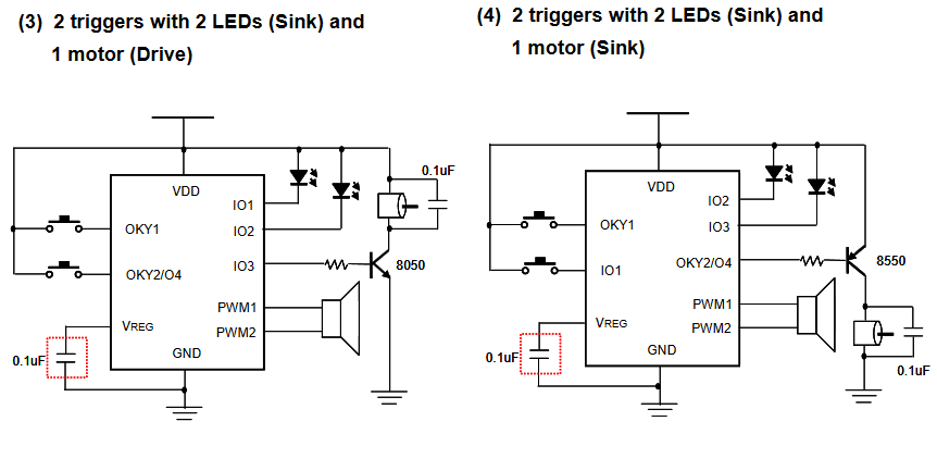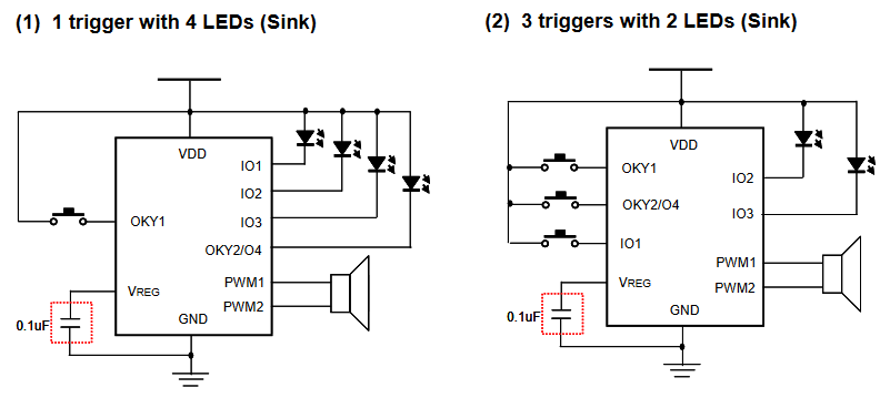 序列觸發功能(Serial-Trigger): 在 Edge/Unhold/Retrigger 觸發模式下,使用OKY1或OKY2的 One-Key Sequential 和 Reset 功能,并設定觸發Debounce時間為Short Debounce,這樣就可以利用外部序列訊號輸入來控制OKYx 的特定Sentence播放,通常搭配外部MCU來控制。