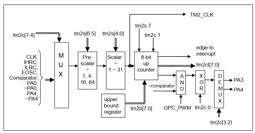 Timer2 的 8 位計數器只能執行上升計數操作,經由寄存器 tm2ct,計數器的值可以設置或讀取。當 8 位計數