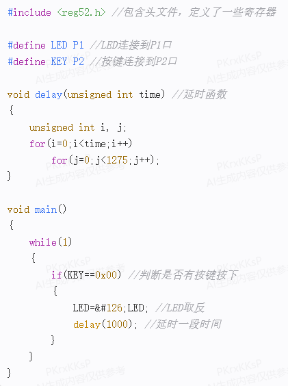 該程序中,我們首先定義了LED和按鍵所連接的寄存器,然后在主函數中,通過一個無限循環來不斷檢測按鍵的狀態。如果檢測到按鍵被按下,則將LED的狀態取反,并延時一段時間,以實現LED燈的開關控制。同時,通過將LED連接到P1口,我們可以通過軟件控制LED燈的亮度,使其更具有靈活性和可擴展性。