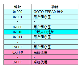 表格和中斷入口。復(fù)位之后,程序從 FPP0 的初始地址 0x000 開始,執(zhí)行 GOTO FPPA0 語句。中斷入口是 0x010。