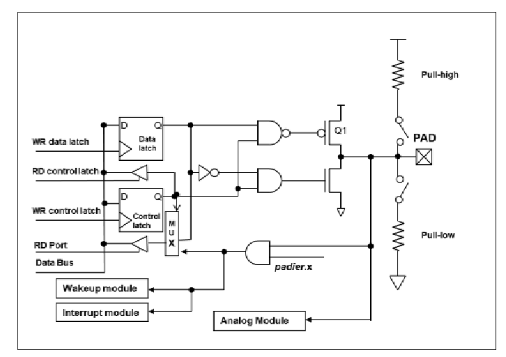 拉電阻(papl)設定成輸入或輸出,每一 IO 引腳都可以獨立配置成不同的功能;所有這些引腳設置有施密特觸發