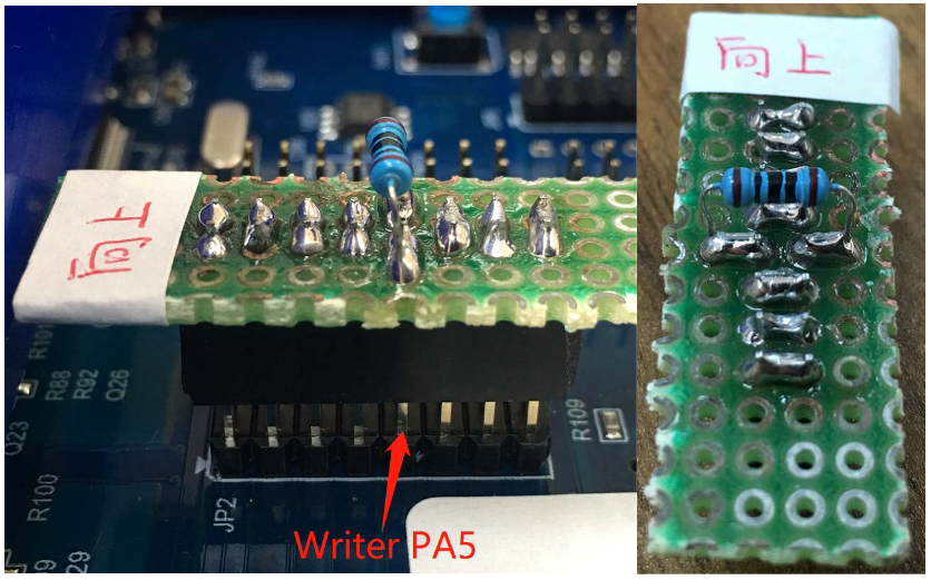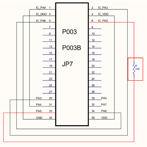 若燒錄 U06 封裝的 IC,請在 JP7 的 PA5 引腳處串一個 100Ω 的電阻,連接方式如圖 2 所示: