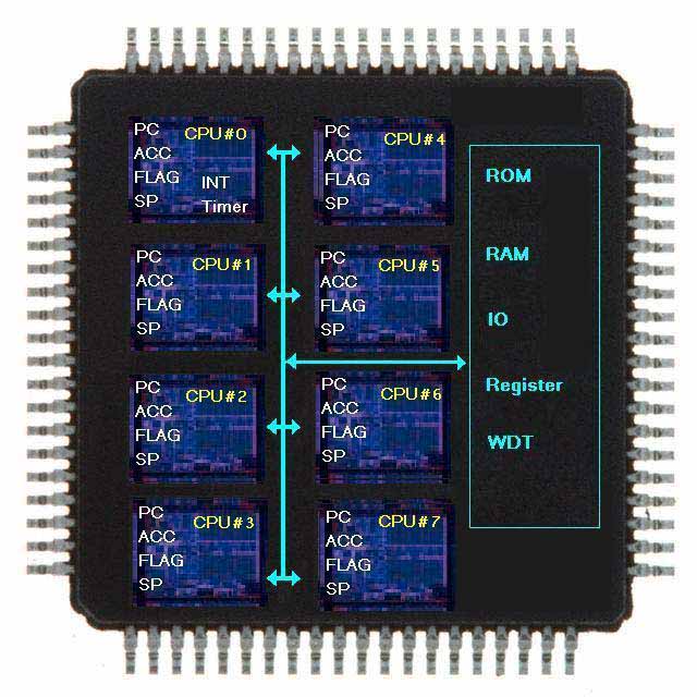 基本上應(yīng)廣科技(Padauk )的FPPA, inside 了8 顆RISC type 1T 的MCU, 除了每顆MCU 有自己的Flag ,PC counter, Stack pointer, Accumulator 外,其余的ROM,RAM,IO 等是共用的 .故每一MCU 都可隨時(shí)監(jiān)控其他MCU 的狀況.(MCU#0 還多了16bit 的timer & 中斷管理可處理I/O中斷和內(nèi)部中斷).