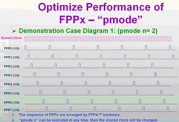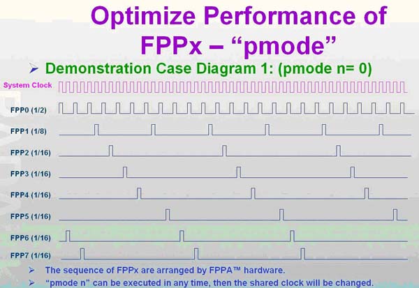 下圖為 pmode=0 ,FPP#0 = 1/2 system clock, FPP#1 = 1/4 system clock, FPP#2-FPP#7 = 1/16 system clock ,每個(gè) FPP 的 cycle 如下