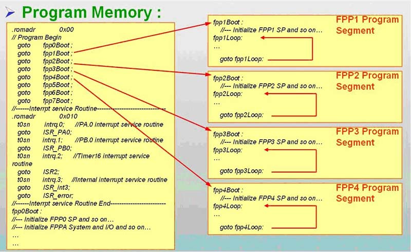 如上圖所示,和大多數(shù)的MCU 一樣,FPPA 也有所謂“中斷向量表”的概念,只是一般MCU 的中斷向量是“中斷副程式” 的進(jìn)入位置,FPPA 的中斷向量是各FPP 的進(jìn)入位置. 如上圖中address 0h-7h 分別為FPP#0-7 的進(jìn)入位置,address 0x10 才是“中斷副程式” 的進(jìn)入位置,故其程式寫(xiě)法如下
