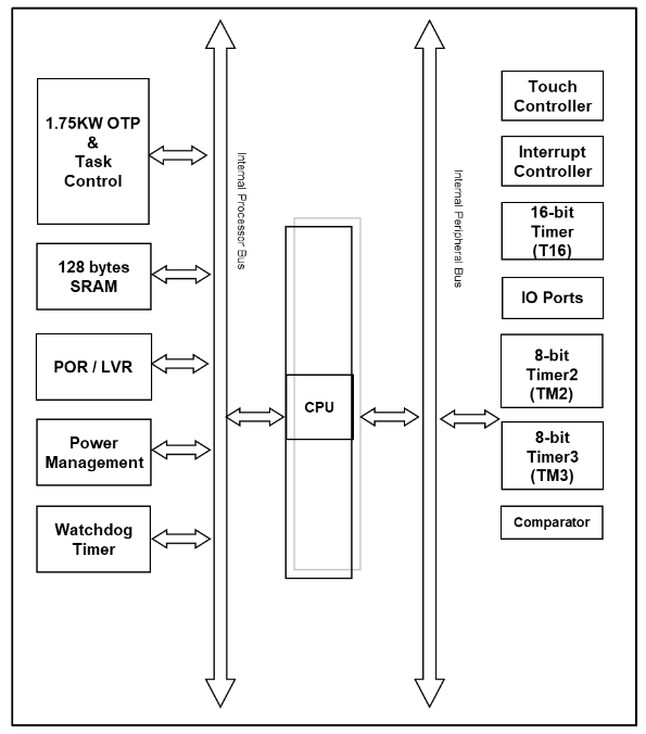 PMS164 包含一個(gè)最多 12 鍵的電容式觸摸控制電路。另外,PMS164 還包含 1.75KW OTP 程序內(nèi)存以及