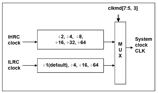 系統(tǒng)時(shí)鐘來(lái)自 IHRC 或者 ILRC,PMS164 的時(shí)鐘系統(tǒng)的硬件框圖,如圖所示: