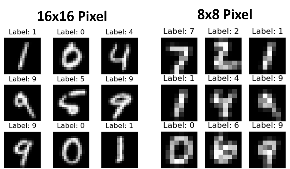 上圖顯示了兩種分辨率下數(shù)據(jù)集中的幾個樣本。在 16×16 下仍然很容易區(qū)分不同的數(shù)字。在 8×8 下仍然可以猜出大多數(shù)數(shù)字,但會丟失大量信息。