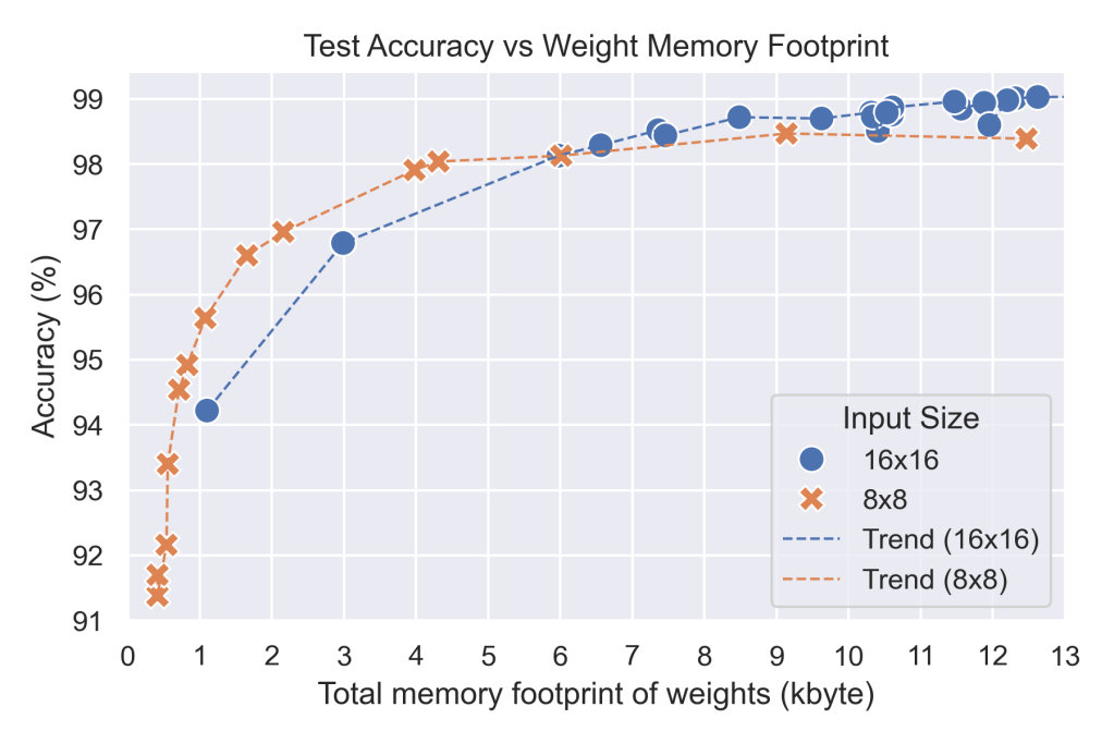 上圖顯示了我的超參數(shù)探索實驗的結(jié)果,比較了具有不同權(quán)重配置和量化級別(從 1 位到 4 位)的模型,用于 8×8 和 16×16 的輸入圖像。最小的模型必須在沒有數(shù)據(jù)增強的情況下進行訓(xùn)練,否則它們不會收斂。