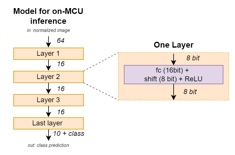 由于 RAM 限制為 64 字節(jié),因此模型結(jié)構(gòu)在推理過程中必須使用最少數(shù)量的潛在參數(shù)。我發(fā)現(xiàn)可以使用窄至 16 的層。這會將推理期間的緩沖區(qū)大小減少到僅 32 字節(jié),一個輸入緩沖區(qū)和一個輸出緩沖區(qū)各 16 字節(jié),其余 32 字節(jié)用于其他變量。8×8 輸入模式直接從 ROM 讀取。