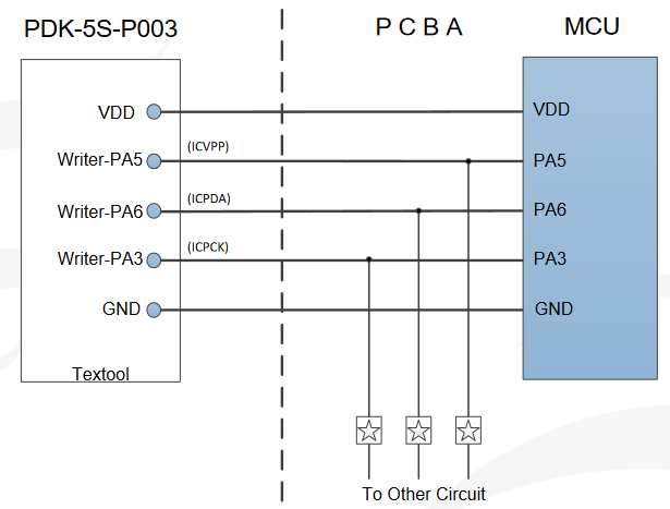 IC 進行燒錄的情況。在板燒錄需要使用 PDK-5S-P-003 上五根引線:ICPCK、ICPDA、VDD、GND 和 ICVPP,