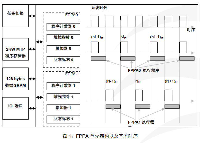 FPPA0 和 FPPA1 共享 2K words MTP 程序存儲器,128 bytes 數據 SRAM 以及所有的 IO 口,這兩個 FPPA