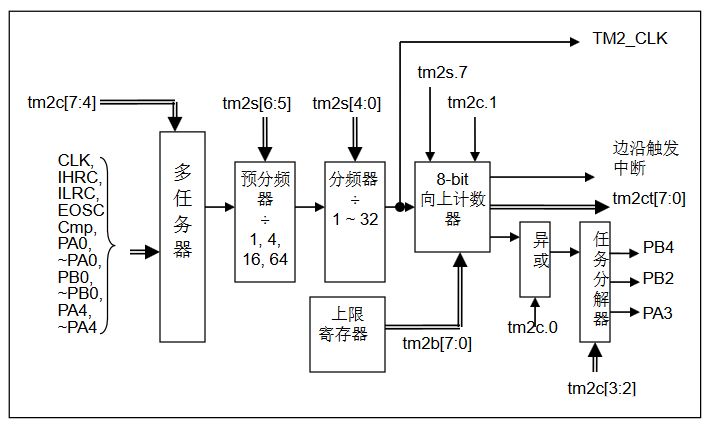 8 位 PWM 定時器只能執行 8 位上升計數操作,經由寄存器 tm2ct,定時器的值可以設置或讀取。當 8 位