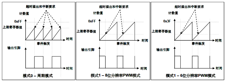 周期或 PWM 占空比。8 位 PWM 定時器有兩個工作模式:周期模式和 PWM 模式;周期模式用于輸出固定周