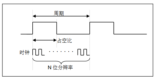 取決于時基(fPWM = 1/TPeriod),PWM 的分辮率取決于一個時基里的計數個數(N 位分辮率, 2N × Tclock = TPeriod)