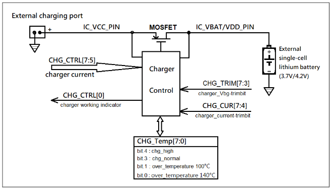 MCU 程序可讀取寄存器 CHG_CTRL[0]來(lái)判斷充電器工作狀態(tài)。讀取寄存器 CHG_Temp[4]可用于判斷充