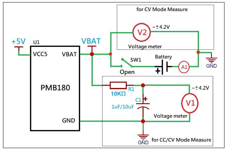 量測(cè) PMB180 充電器的充電電壓接線圖如下示意:在 CC Mode 下需在 VBAT 引腳串聯(lián) RC 電路(仿