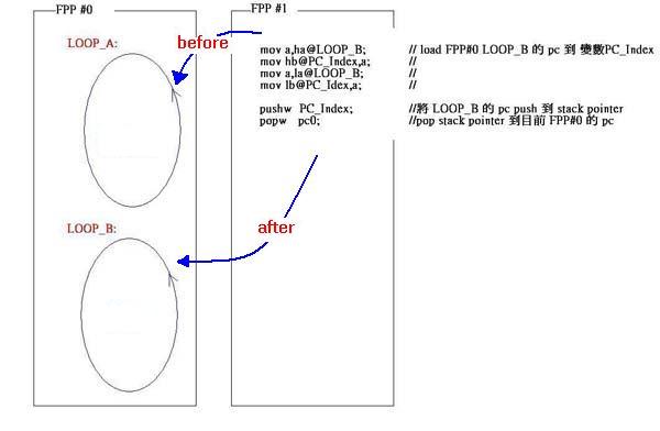 由于PFPA 是一顆8 核心的MCU,不同MCU 間可更改彼此的程式指標(biāo)“pc”, 來達(dá)到強(qiáng)迫其他MCU 去執(zhí)行某段程式的路徑之目的,但要小心運(yùn)用,否則容易破壞程式的結(jié)構(gòu).下例中的FPP#0 原本只會(huì)在LOOP_A無窮的回圈中打轉(zhuǎn), FPP#1 經(jīng)由“pushw” 和“popw” 改變了FPP#0 的程式指標(biāo), 讓FPP#0 變在LOOP_B無窮回圈中打轉(zhuǎn).