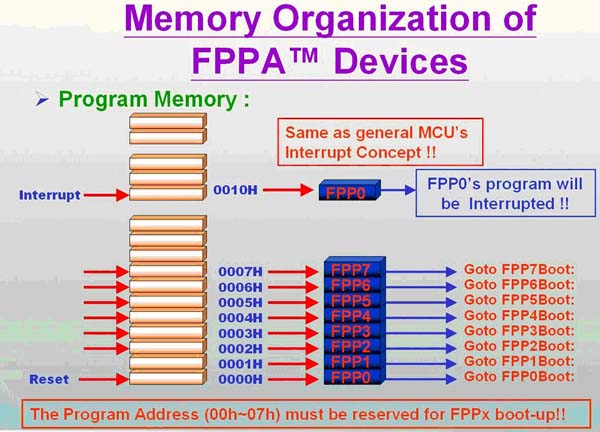 基本上應(yīng)廣科技(Padauk )的FPPA, inside 了8 顆RISC type 1T 的MCU, 除了每顆MCU 有自己的Flag ,PC counter, Stack pointer, Accumulator 外,其余的ROM,RAM,IO 等是共用的.故每一MCU 都可隨時(shí)監(jiān)控其他MCU 的狀況.(MCU#0 還多了16bit 的timer & 中斷管理可處理I/O中斷和內(nèi)部中斷).
