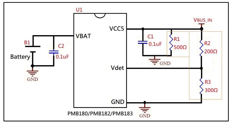 R1 或是(R2+R3)的電阻值需小于或等于 500ohm (可以避免 VBAT 與 VCC 有較大漏流問題