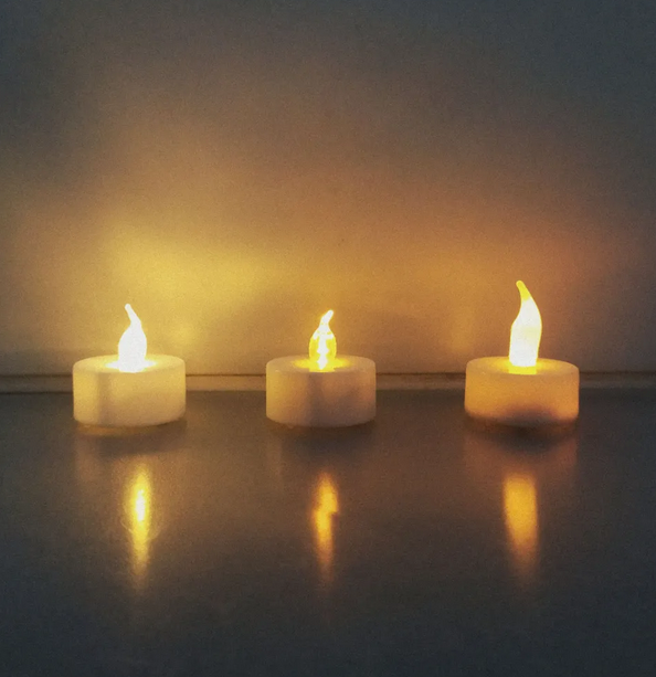 三個 LED 蠟燭,分別帶有 PFS154(左)、PMS150C(中)和閃爍 LED(右)