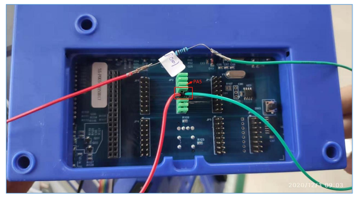 在 ?**JP7 的 PA5 引腳**串聯 ?**100Ω 電阻**。連接方式參考圖2: