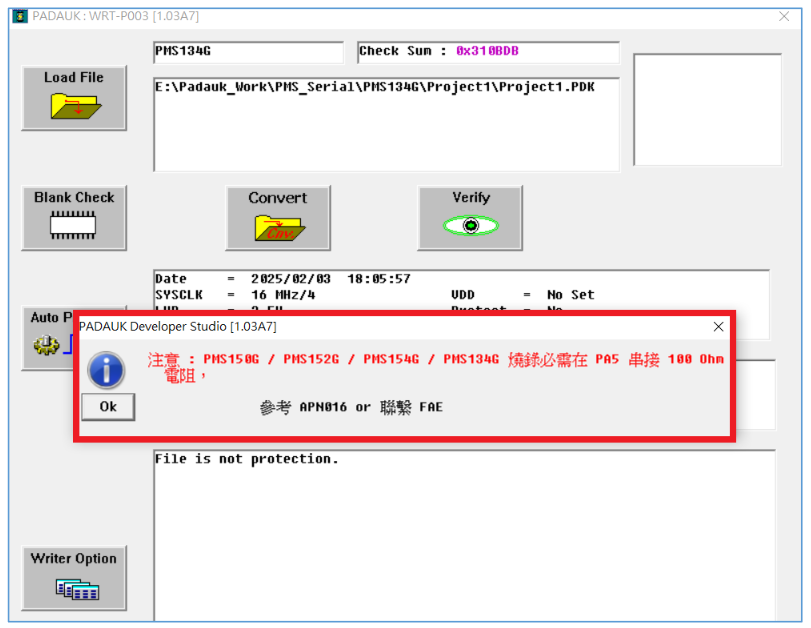 下載PDK燒錄文件至燒錄器時,軟件會顯示 ?**?“PA5需串接電阻”?** 的提示窗口,如下圖所示: