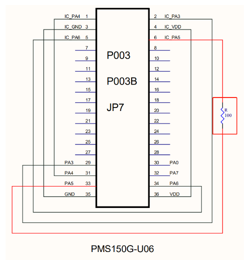 如何解決芯片燒錄良率下降,應廣科技單片機PMC-APN022芯片燒錄接線指南–在 PA5 引腳串聯電阻,針對部分芯片在半自動機臺燒錄時可能受雜訊干擾導致燒錄良率下降或引腳擊穿的問題,PMS150G-100R燒錄轉接板