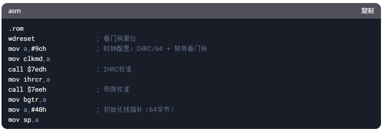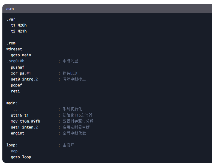 .rom wdreset goto main .org010h ; 中斷向量 pushaf xor pa,#1 ; 翻轉LED set0 intrq.2 ; 清除中斷標志 popaf reti main: ... ; 系統初始化 stt16 t1 ; 初始化T16定時器 mov t16m,#9fh ; 配置時鐘源與分頻 set1 inten.2 ; 啟用定時器中斷 engint ; 全局中斷使能 loop: ; 主循環 nop goto loop