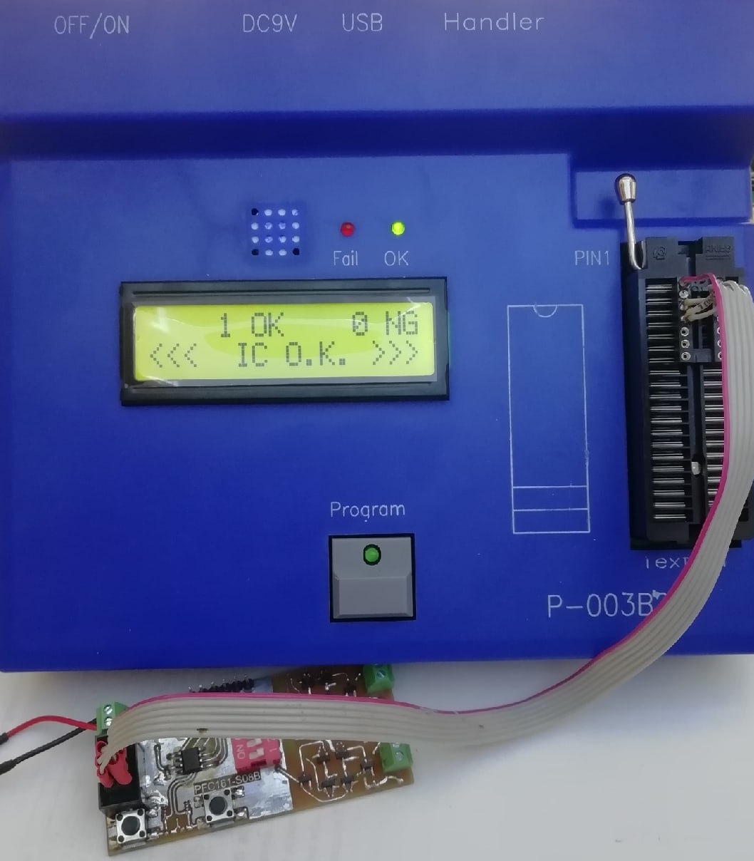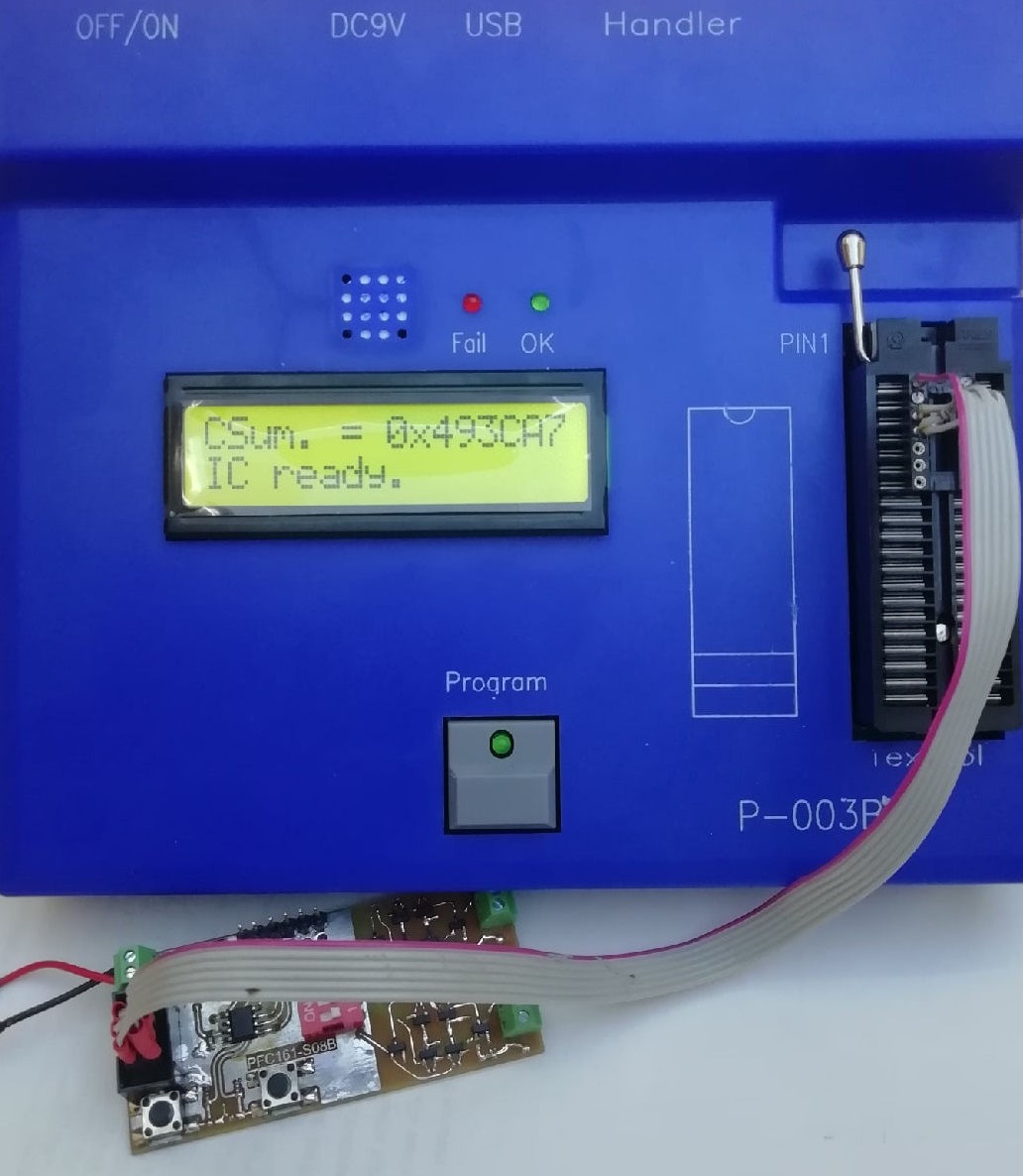 現(xiàn)在,您可以將我們的微控制器連接到前面板。由于我們將對(duì)內(nèi)部程序進(jìn)行編程,因此您需要一根連接調(diào)試板上的連接器和程序員前面板上的夾緊面板的導(dǎo)線。我們將制作另一個(gè)適配器,連接適當(dāng)?shù)囊_,在調(diào)試板上到程序化器的連接器。在程序員的屏幕上將有一個(gè)銘文“IC ready”,這意味著微控制器已準(zhǔn)備好固件。