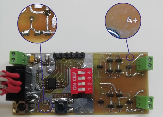 信號(hào)和電源路徑,厚度為0.25毫米,僅用于測(cè)試LUT技術(shù)的能力。有趣的是,獲得了微型接觸指定(在印刷電路板的形式上很高)。起初我以為它們會(huì)在轉(zhuǎn)移圖紙或蝕刻時(shí)消失得無(wú)影無(wú)蹤,但沒(méi)有,保存!符號(hào)線的厚度為0.07毫米。