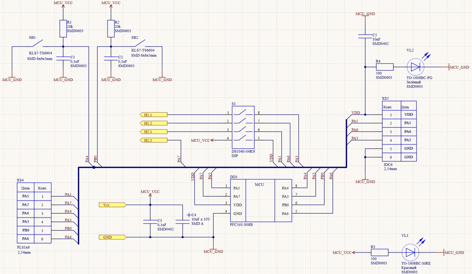 為實(shí)驗(yàn)開(kāi)發(fā)了調(diào)試費(fèi)。微控制器PFC161的文檔說(shuō),微控制器支持架構(gòu)內(nèi)編程模式。為此,使用了五條程序員線:ICPCK、LASPA、VDD、GND和ICVPP。它們分別連接到微控制器的引腳:PA3、PA6、VDD、GND 和 PA5。