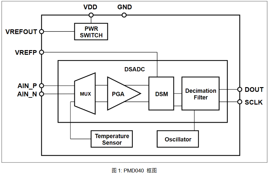 PMD040 是一款低功耗、高精度 Δ-Σ ADC。它內置一個三角積分 ADC、一個差分輸入通道和一個溫度傳