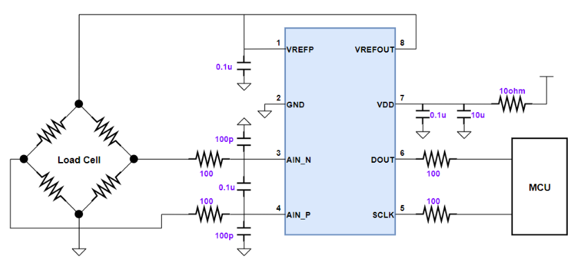 - 電源管理:集成高壓側電源開關,導通電阻低至 6Ω(5V),可直接為稱重傳感器等外設供電,掉電時自動切斷電流以節省功耗;